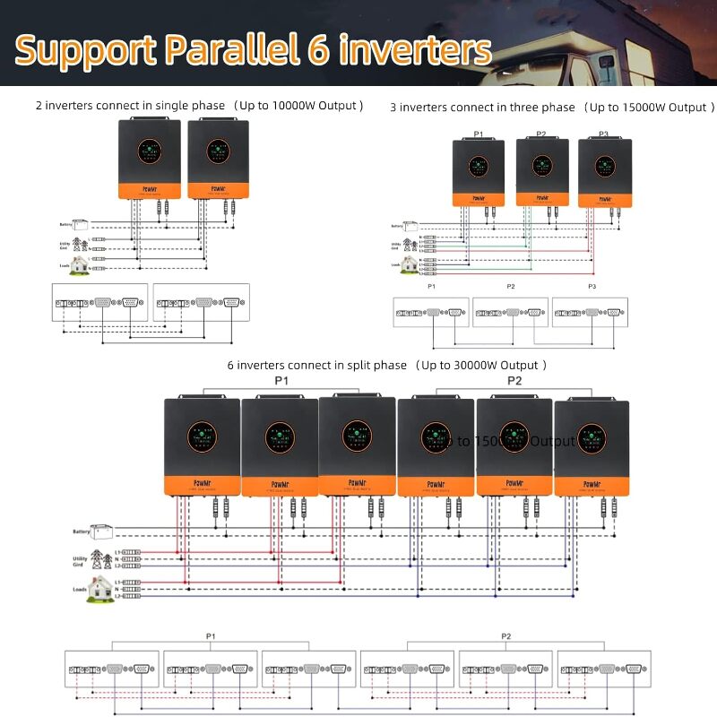 Scalable Power with Full Protection: The PowMr 5200W Solar Inverter supports 6-unit parallel operation, enabling 240V split-phase (2 units) or 208V 3-phase (3 units) setups. Expandable up to 31.2kW for high-capacity needs. Features CAN/USB/RS485 for smart monitoring. 360° Safety: Short-circuit, over/under-voltage, overload, and backfeed protection ensure reliable operation. Perfect for homes, cabins, RVs, boats, and off-grid backup.