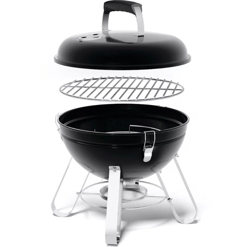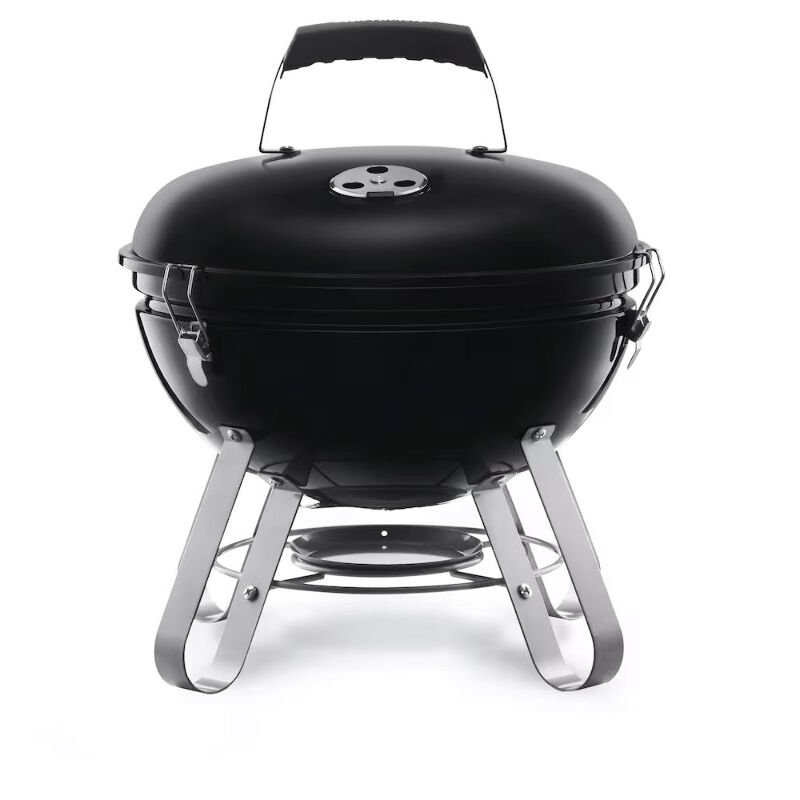 Grill with charcoal on the go with our 14-inch Portable Charcoal Grill. This black porcelain enamel kettle BBQ is the perfect size for picnics, reflecting the heat just like our larger charcoal kettles, creating the ideal environment for something slow smoked or seared to perfection. The charcoal basket is divided to make grilling your way easy, even on the go. Top and bottom vents ensure that temperature is easy to control. Easily carry this lightweight little barbecue wherever you are adventuring from the Cool Touch handle, the locking lid latches keep everything securely together. The easy to assemble four-legged design is stable no matter where you're grilling. The chrome-plated cooking grids are easy to clean, and when you're done barbecuing so are the spent coals. The steel-plated ash catcher is easy to remove. Just empty, latch that lid on, and go on your next adventure.