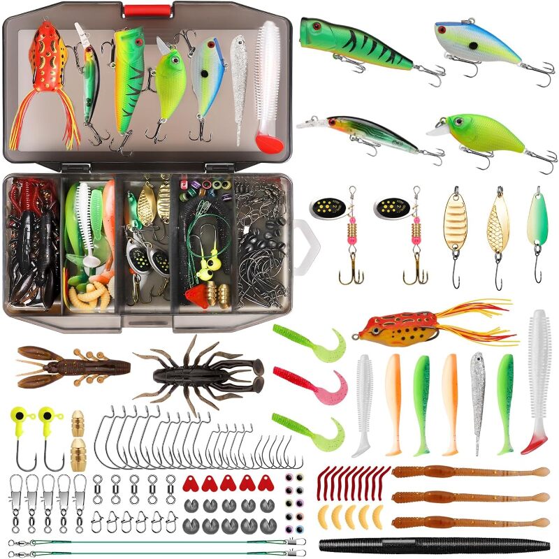 Amazing 110PCS Fishing Lure kit GOTOUR fishing lure kit including 1pcs Crankbaits, 1pcs Popper, 1pcs Frog, 1pcs Minnow, 1pcs VIB, 3pcs Spoon, 2pcs Spinners, 32pcs Soft bait, 68pcs fishing accessories, and 1pcs custom tackle box. The versatile fishing tackle kits have everything tools you need to catch a variety of fish in any season and in any way.