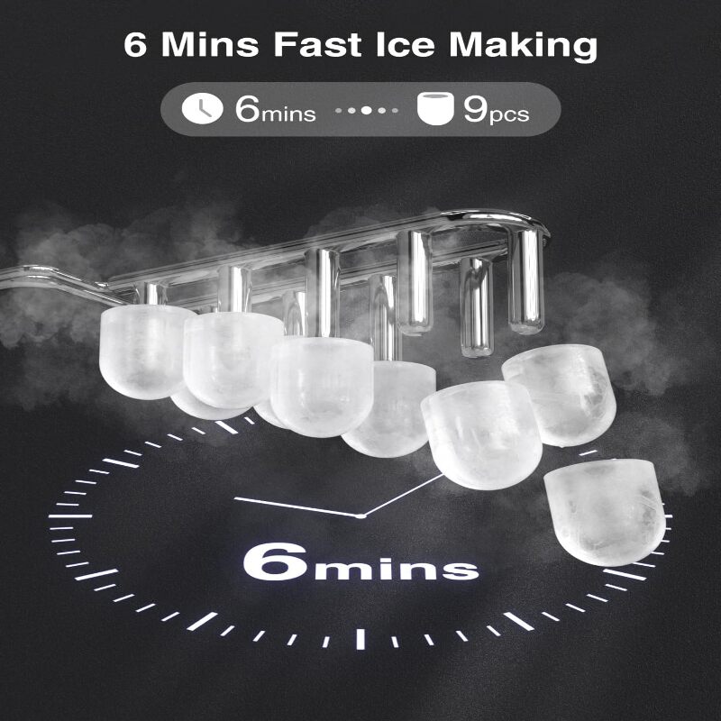6 Min Fast Ice Making: The ice maker countertop can make 9 bullet ice cubes in just 6 minutes and up to 26lb ice cubes in 24 hours. Portable ice makers can quickly make 2 size of bullet ices that can cool your drinks. Whether you're at a family activities or at work, you can enjoy ice drinks anytime, anywhere.