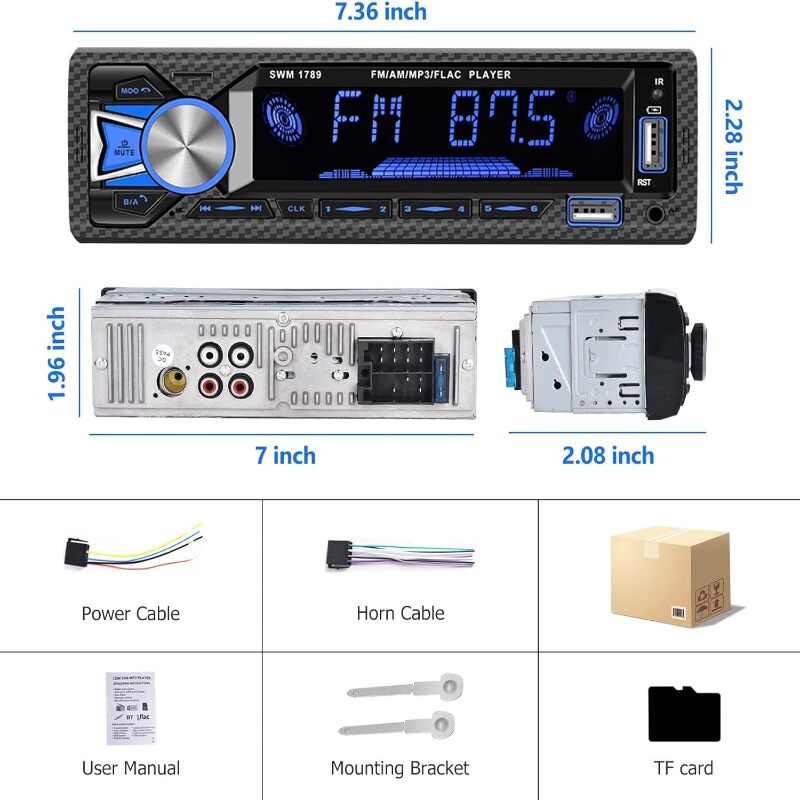 - Single Din Car Stereo: Item Size: 178(W)*58(H)*50(D)mm/7.0*2.28*3.35inch; Single Din Car Stereo with SD/MMC card slot and USB 2.0 port. Support microphone input and subwoofer output, allowing you to enjoy the melodious music while driving.8G TF Card included