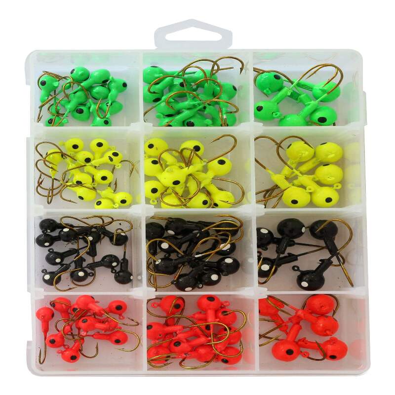 The Red Wolf Jig Head Kit, 100-pc, has everything you need to catch a variety of fish species. With 100 jig heads in a wide range of weights from 1/8 ounce to 3/8 ounce and multiple colour options, this kit covers all your jigging needs. The jig heads are packaged in a reusable utility box that helps keep your tackle organized, so you're ready to catch fish no matter the conditions. Whether you're fishing for trout, bass, or panfish, this complete jig head assortment will have the right lure for the job.