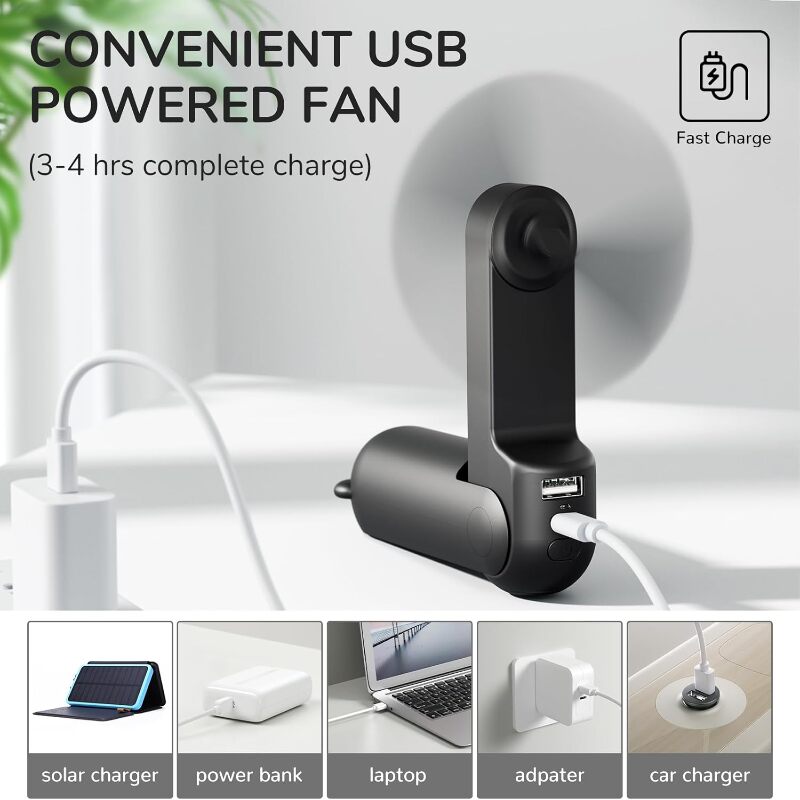 Diseño plegable y tamaño mini: Su diseño plegable facilita su transporte y almacenamiento. Además, con su forma de cápsula (13,9 x 4,2 x 4,2 cm, peso: 170 g), este ventilador recargable oculta las aspas, lo que lo hace pequeño y fácil de guardar en el bolsillo o el bolso.