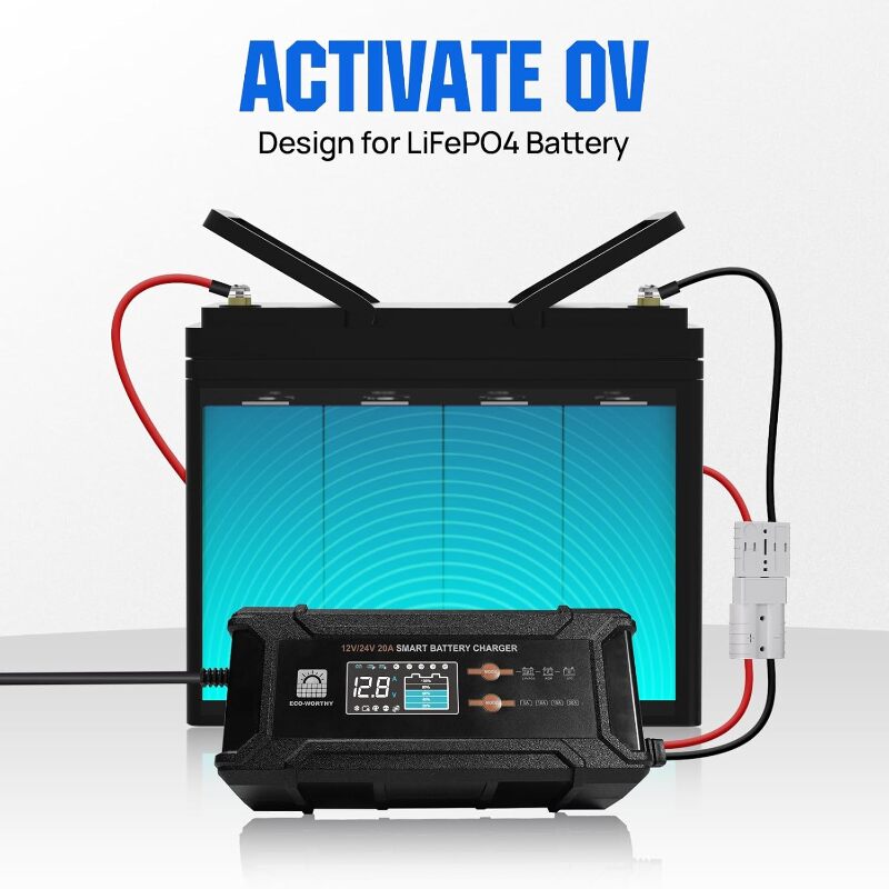 - LiFePO4 Battery Activation Function: ECO-WORTHY 12V/24V 20A Automatic smart battery charger can activate batteries that trigger BMS protection due to excessive discharge or long-term non-use. It can extend LiFePO4 battery life to enhance battery performance.