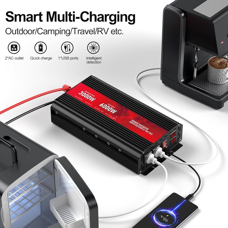 - Upgraded Version Low No-Load Consumption:True rated continuous 3000W and 6000W peak power. Convert DC 12V to 110/120VAC tech save more energy from high conversion efficiency (>90%) and low no-load loss.With 2 AC outlets,LCD Display and 2.4 A USB port.No load draws current 1士0.2A.