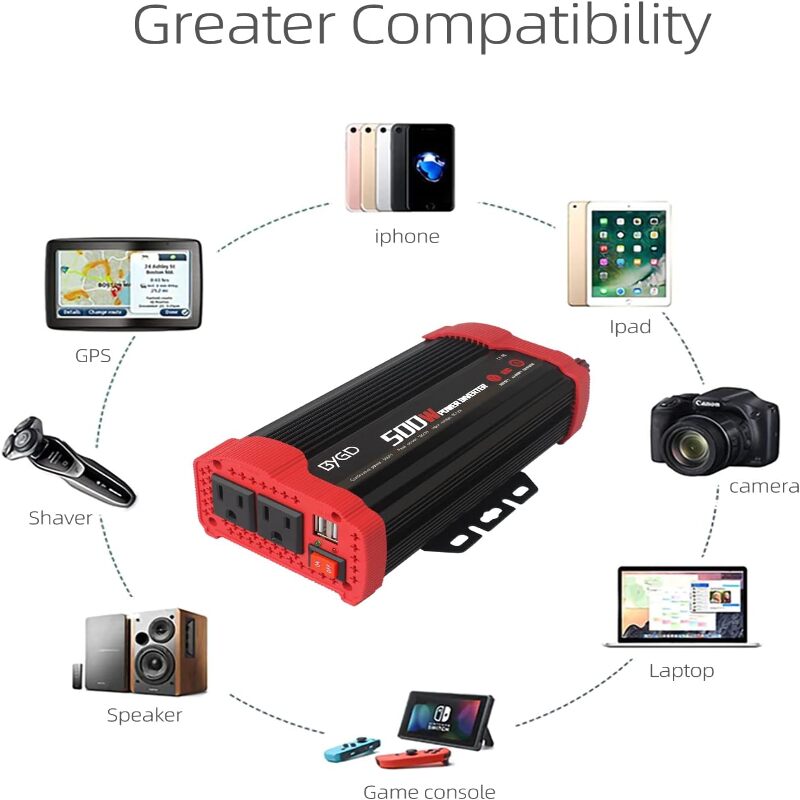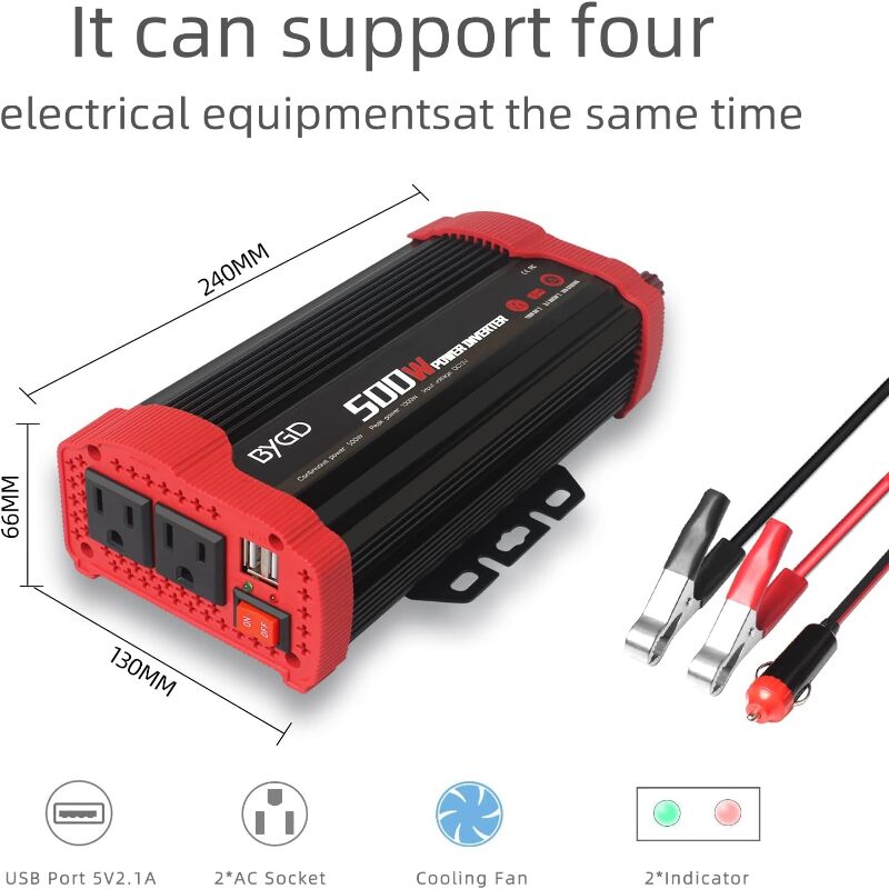 Function: The power inverter offers 500W continuous DC to AC power and 1000 watts of peak power, with 2 AC sockets and 2 2.1A fast charging USB ports, make it the best choice for camping, traveling
