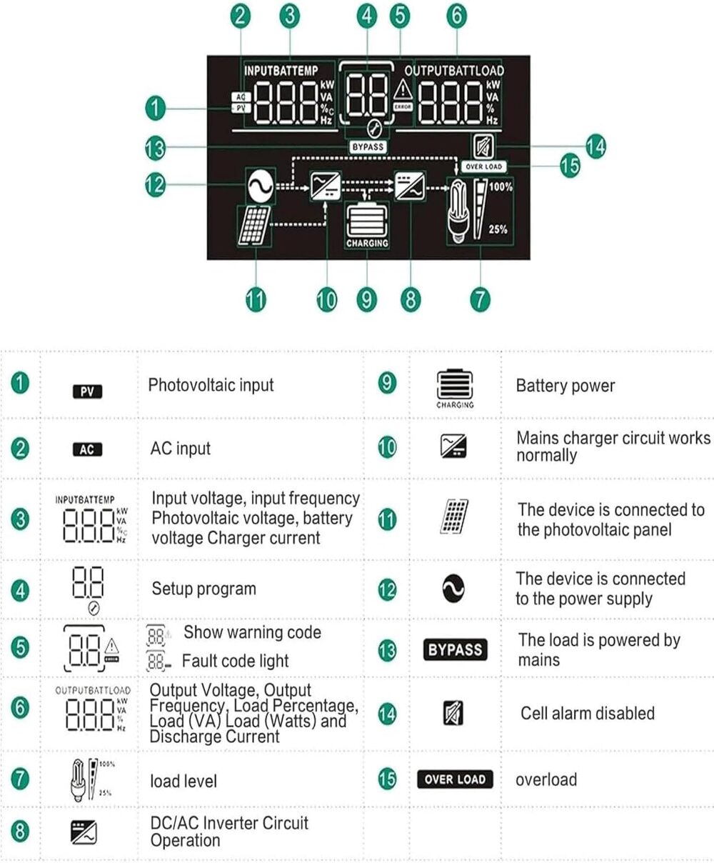 WITH LCD AND LED DISPLAY SCREEN: The solar inverter is equipped with an LCD display screen and three LED indicators to dynamically display data and operating status. Monitoring the charging status via the screen: input/output voltage, battery capacity indicator, etc. WIFI and GPRS remote monitoring for IOS and Android allows users to monitor the status of PV anytime, anywhere via their mobile phones or websites.