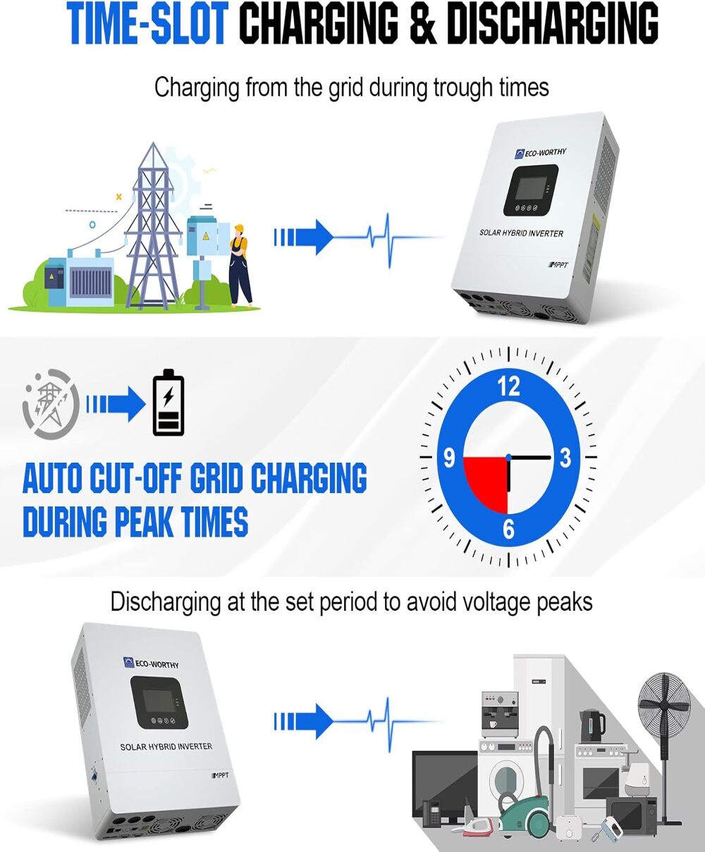 - Segmented Charing/Discharging: Three output modes: mains priority, battery priority, PV priority; uninterrupted power supply; Available in 4 charging modes: Only Solar, Mains Priority, Solar Priority and Mains and Solar hybrid charging; Set a flexible time period for mains charging/discharging according to the local mains condition, and help you save the mains