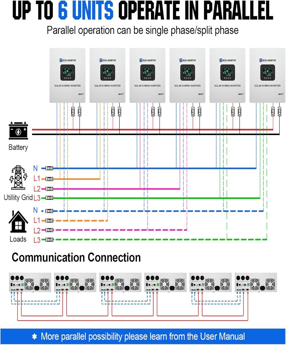 - Parallel Supportable: Parallel support up to 6 units-30 kw Max. It can be single phase or separate phase parallel; The output voltage of one inverter is 120 V, and more than two inverters can output 120 V/208 V/240 V in parallel