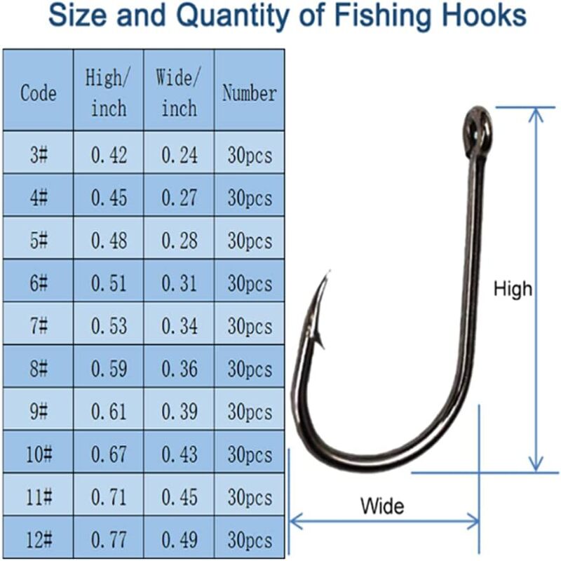 A reasonable combination of fish hooks, 3#, 4#, 5#, 6#, 7#, 8#, 9#, 10#, 11#, 12#, a total of 10 types of fish hooks 30PCS each.
