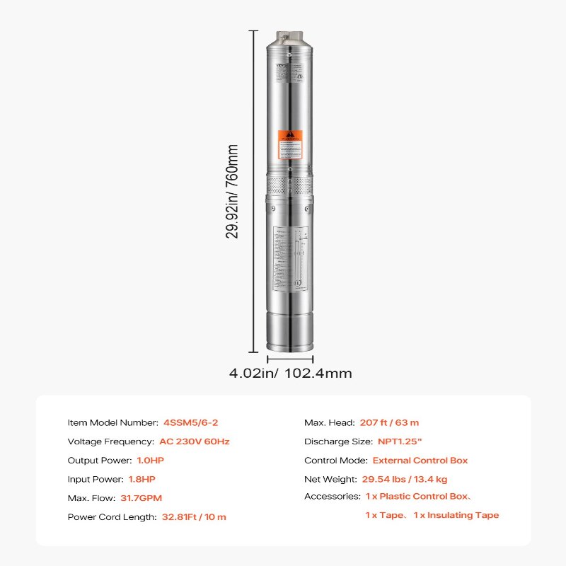 1HP Deep Well Submersible Pump Stainless Steel Pump 230V 31.7 GPM 207 ft