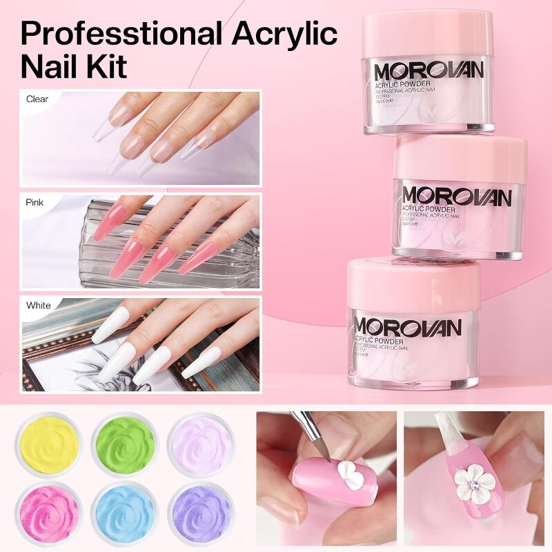MOROVAN FULL ACRYLIC NAIL KIT WITH DRILL: The professional acrylic nail kit with drill comes with everything acrylic nail tools supplies to create acrylic nails, 3 colors acrylic powders, acrylic nail brushes for acrylic application, electric nail drill, gel top base coat and primer. Complete acrylic nail kit set professional with everything is ideal for both professional nail technician and DIY nail starter lover.