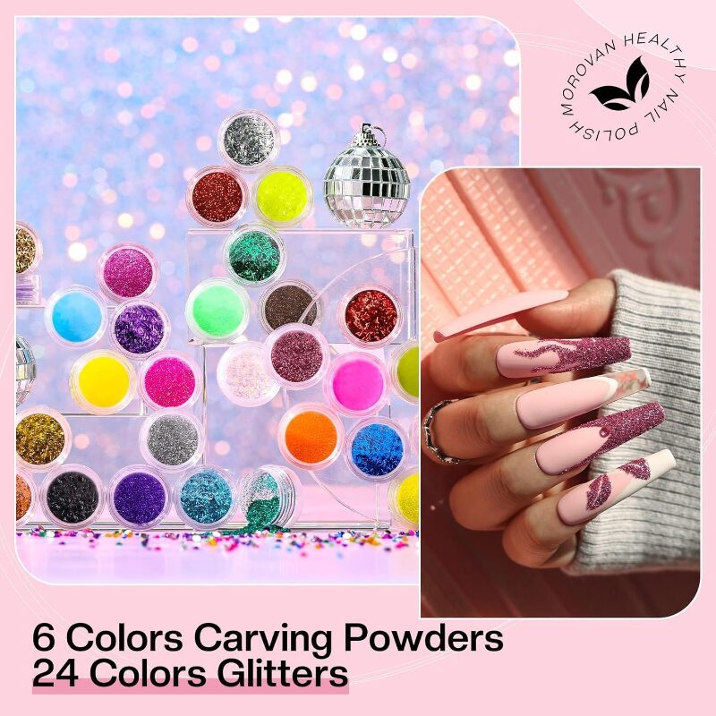 GLITTER ACRYLIC POWDER SET : Morovan acrylic powders are made from a non-yellowing formula, acrylic powders can be mixed with nail brush cleaner to form a bubble-free polymer, providing perfect transparency and excellent adhesion. With this acrylic nail kit with drill , you can create acrylic nails extension for long lasting sparkle effect.