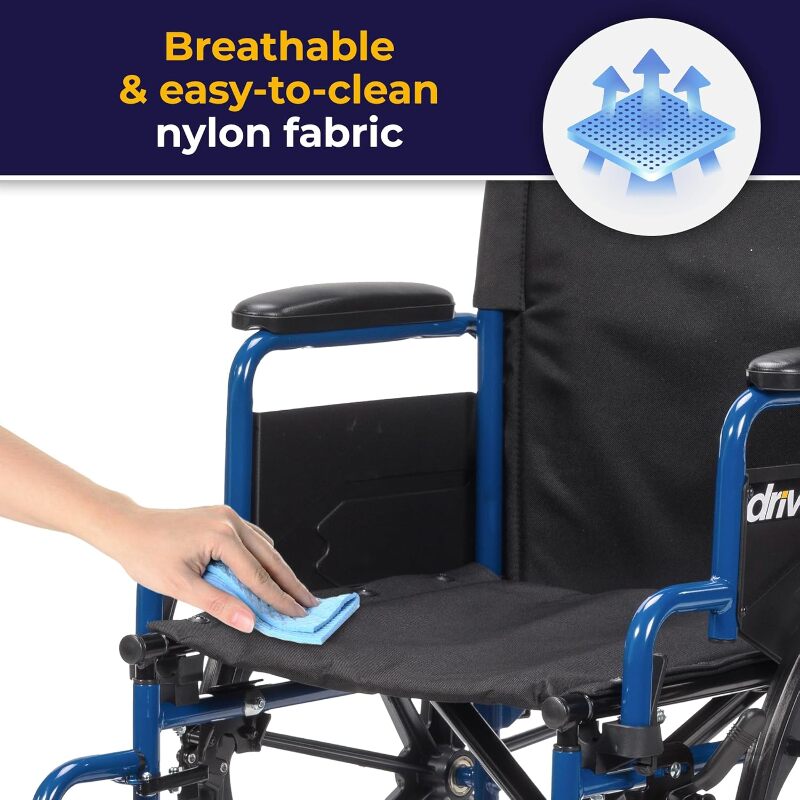 A mobile masterpiece of class... Durability and comfort The blue streak wheelchair with flip back desk arms from Drive Medical represents a new class of Leading-Edge mobility enhanced wheelchairs that have been engineered and structured, to not only meet, but exceed the growing demands and expectations of users who cherish independence, mobility and comfort.It arrives at your door loaded with features designed to enable and enhance your mobility and comfort. Arm rests are fully padded. The frame, black cross brace and the nylon upholstery is durable, attractive and easy to clean.The tires which are made of solid rubber, give you an enormous amount of durability. If that wasn't enough, this leading edge mobility aid also requires little to no maintenance.Users also appreciate that the blue streak wheelchair comes with easy to operate push to lock brakes, along with convenient swing away footrests with plastic footplates that allow you the user, too safely, effortlessly and with convenience, slide in and out of your chair.You'll also appreciate the padded desk arms which furnish you with unbeatable comfort, allowing you to slide up as close as you desire, and need to be to tables, and or desks. Go ahead...Experience the drive difference now.