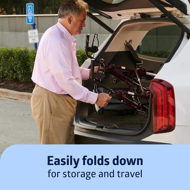 Medline Extra-Wide Bariatric Rollator with 400 lb Weight Capacity A rollator allows you to safely walk along or sit on the padded seat if you become tired. Unlike a regular walker, a rollator doesn’t involve the lift that a normal walker requires, making walking a smoother process. A rollator, however, requires the user to be stable enough to not let it get away from them since it has wheels. We have reinforced our basic rollator to accommodate higher weight capacities. Our extra-wide heavy-duty rollator has a wider seat and greater distance between the handles for people that need, or want, extra room. NOTE: This rollator is 29-Inch wide and may not fit through standard door frames found in the home. Sturdy light-weight aluminum frame, weighs 19 lbs View larger Larger than standard rollators measuring at 29'' W x 44.5'' H x 29'' D View larger Folds easily for storage View larger Extra wide seat (17.5''x14'') and greater distance between handles (23.5-Inch ) View larger Basket can fit under the seat or in the front (basket dimensions: 18.5'' W x 8.5'' H x 5.75'' D) View larger Simply open up seat to access storage View larger Features: Sturdy light-weight aluminum frame: weighs 19 lbs Reinforced design to support higher weight capacities Wider distance between handles for users needing extra room Loop-style brakes you push down to lock and pull up to release Padded backrest and padded seat offer users ability to rest Larger than standard rollators measuring 29'' W x 44.5'' H x 29'' D (may not fit through all door frames) Extra wide seat (17.5''x14'') with velcro pocket underneath Bright burgundy color Supports up to 400 lbs. 8-Inch wheels with reinforced forks and spokes for extra strength Folds easily for storage (may not fit in all cars) Handles adjust from 31.5-37.5-Inch allowing users a more customized fit Measurements from floor to seat: 22-Inch (not adjustable)